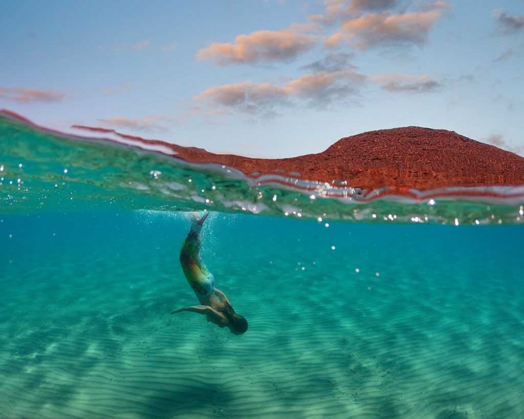 Κάτω από τη θάλασσα όλα είναι διαφορετικά, εκεί ανατρέπονται οι φυσικοί νόμοι της βαρύτητας, υπάρχει μεγαλύτερη ευχέρεια στις κινήσεις, η αίσθηση της ελευθερίας είναι τόσο έντονη που βιώνεις εκείνο που πάντα ο άνθρωπος ονειρευόταν, να πετάει χωρίς το φόβο να πέσει. Κάπως έτσι εμπνεύστηκε αυτές τις εικόνες, καλλίγραμμα σώματα κάτω από το νερό με διάφορα υφάσματα ή γυμνά να αντανακλώνται στην επιφάνεια σχηματίζοντας διάφορα σχέδια δημιουργώντας ένα σύνολο από εικαστικές συνθέσεις μέσα σε μια πανδαισία χρωμάτων δίδοντας μια αισιόδοξη πινελιά και φως, περισσότερο φως στη θολή μας καθημερινότητα.