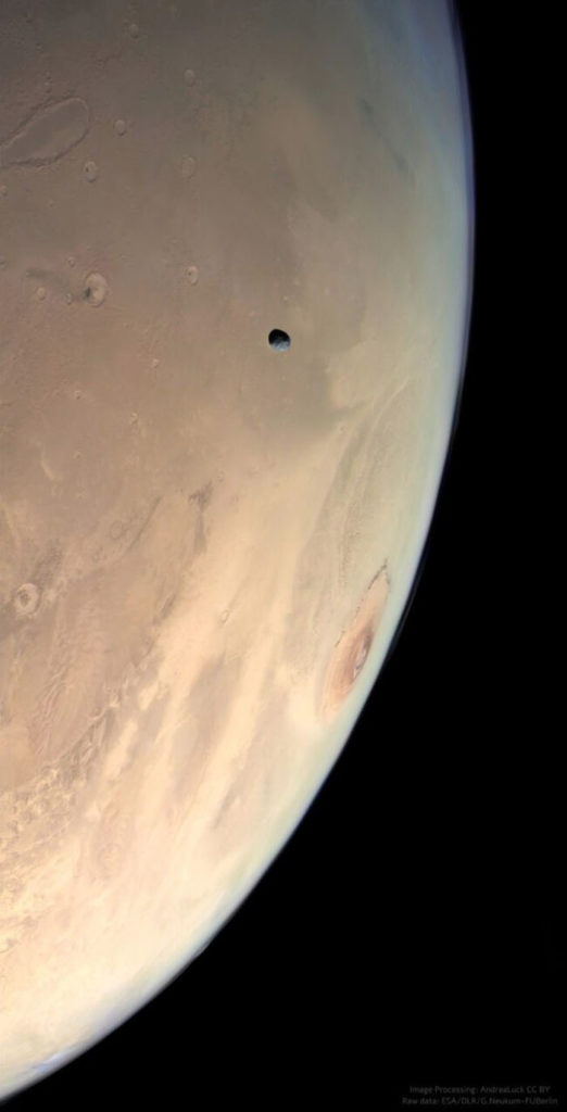 Το πρόγραμμα εξερεύνησης Mars Express από τον Ευρωπαϊκό Οργανισμό Διαστήματος (ESA), ξεκίνησε το 2003. Συμπληρώθηκαν 21 χρόνια από τότε, αλλά οι αποκαλύψεις συνεχίζονται με αμείωτο ρυθμό. Αυτή τη φορά απαθανάτισε μια μοναδική φωτογραφία που όχι μόνο φαίνεται η (λεπτή) ατμόσφαιρα του πλανήτη Άρη, αλλά διακρίνεται το τεράστιο ηφαίστειο Olympus Mons καθώς επίσης και ο Φόβος που περνάει μπροστά από τον κόκκινο πλανήτη (ένα από τα φεγγάρια του):