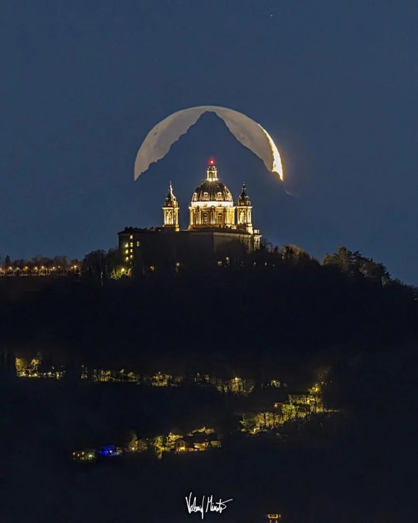 Πρόκειται για την εκπληκτική φωτογραφία του Valerio Minato στην οποία φαίνεται το φεγγάρι τέλεια ευθυγραμμισμένο με τον τρούλο της Βασιλικής Εκκλησίας Superga και την κορυφή του Monviso, γνωστό και ως Monte Viso, που είναι το ψηλότερο βουνό των Κοτιανών Άλπεων. Η φωτογραφία του (δικαίως) βραβεύτηκε ως η “Αστρονομική Εικόνα της Ημέρας” από τη NASA. Ο Minato είχε την ιδέα για αυτήν τη φωτογραφία από το 2017 και από τότε ξεκίνησε την προσπάθειά του να απαθανατίσει το φεγγάρι μαζί με τον καθεδρικό ναό και το επιβλητικό βουνό στο ίδιο πλάνο. Όπως καταλαβαίνετε δεν είναι η ευκολότερη υπόθεση. Αποκάλυψε ότι του πήρε 6 ολόκληρα χρόνια για να πετύχει την τέλεια λήψη και ευθυγράμμιση μεταξύ των αντικειμένων, ενώ δήλωσε ότι πρόκειται για μαγική στιγμή και ότι έκανε το φωτογραφικό του όνειρο πραγματικότητα.