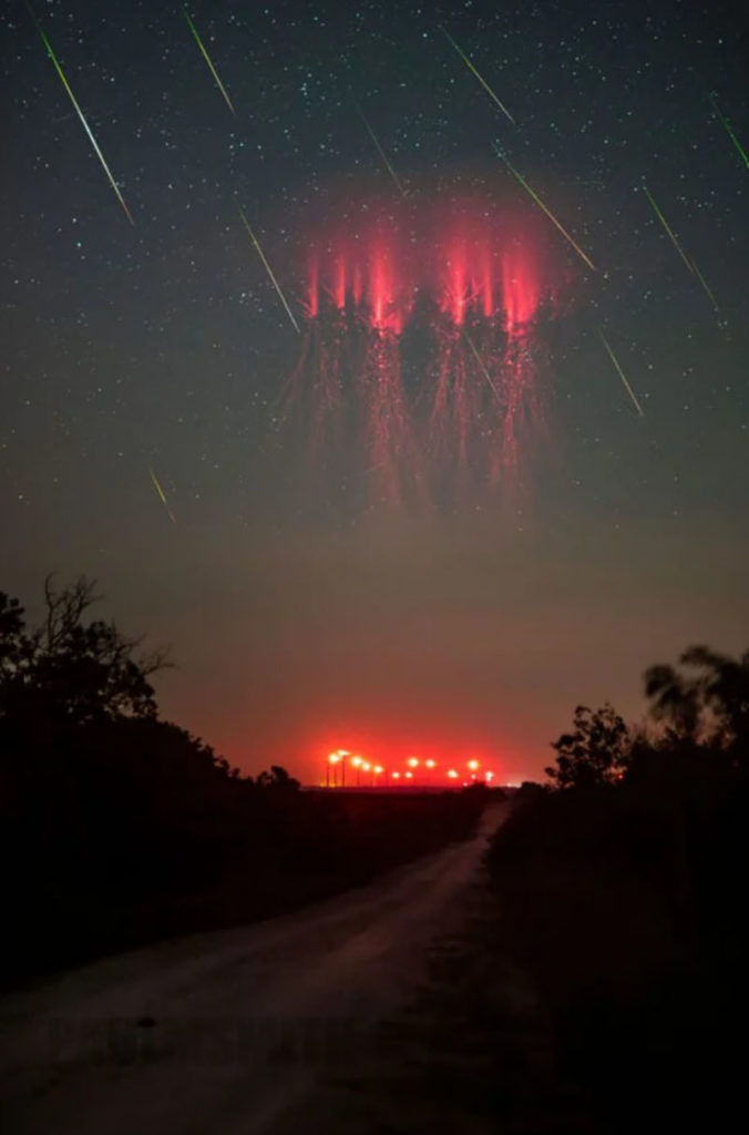 Ο φωτογράφος Paul Smith απαθανάτισε το σπάνιο φαινόμενο κόκκινων κεραυνών μαζί με βροχή μετεωριτών σε μια φωτογραφία.