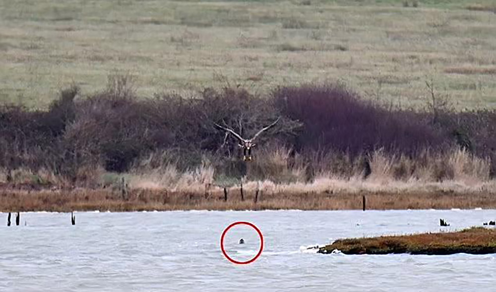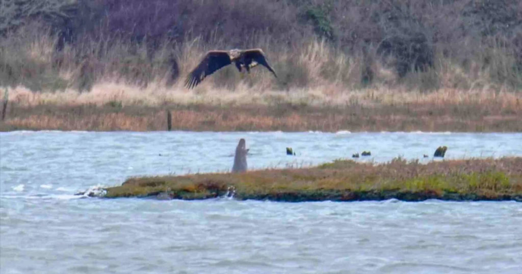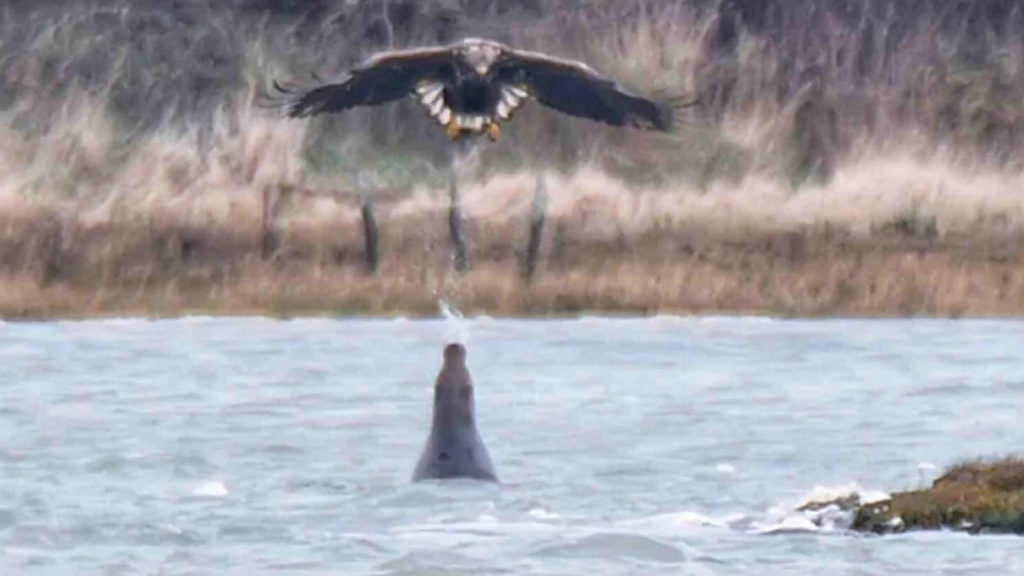 Πρόκειται για μια άνευ προηγουμένου αλληλεπίδραση μεταξύ μίας φώκιας (Halichoerus grypus) και ενός αετού (Haliaeetus albicilla) η οποία δεν έχει καταγραφεί ποτέ ξανά στο παρελθόν! Η φωτογράφος και παρατηρητής πουλιών Clare Jacobs βρισκόταν στο Newtown Harbour στη Νήσο Wight της Αγγλίας, όταν είδε έναν σπάνιο θαλάσσιο αετό με λευκή ουρά να ορμάει προς το νερό. Καθώς πλησίαζε, μία ενήλικη φώκια εμφανίστηκε ξαφνικά στην επιφάνεια και έφτυσε ένα πίδακα νερού προς τον αετό.