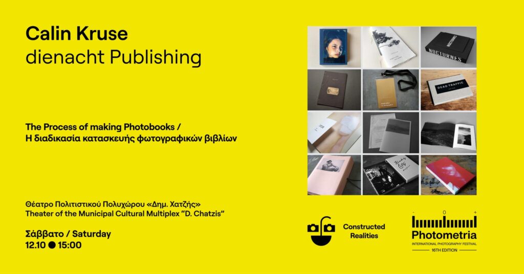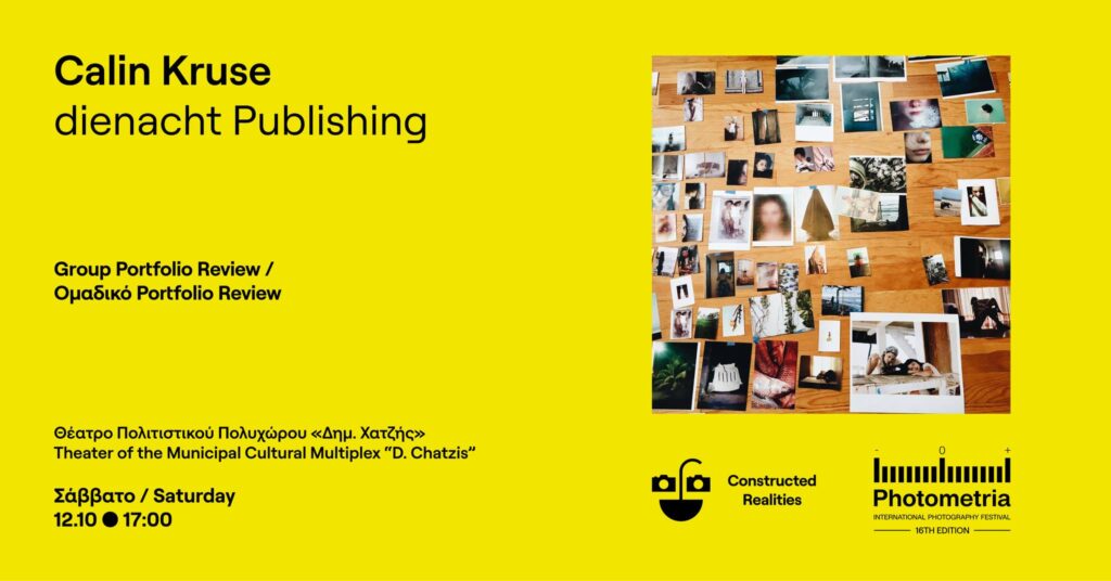 Το Σάββατο 12 Οκτωβρίου υποδεχόμαστε τον Calin Kruse, ιδρυτή και εκδότη της dienacht Publishing. O Kruse θα μιλήσει για τη διαδικασία δημιουργίας photobooks, photozines και artist books. Οι παρευρισκόμενοι θα έχουν την ευκαιρία να γνωρίσουν την dienacht και να μάθουν για τις καλλιτεχνικές αποφάσεις πίσω από τις εκδόσεις dienacht, όπως ο σχεδιασμός, η επιλογή των υλικών, η βιβλιοδεσία, τα συναισθήματα, ακόμη και ο ήχος – καθώς και για τις ιστορίες στο παρασκήνιο: γιατί και πώς η dienacht συνεργάζεται με ορισμένους φωτογράφους, πώς μοιάζει η διαδικασία, η συνεργασία με τους τυπογράφους, τι πρέπει να αναζητούν οι φωτογράφοι όταν ψάχνουν για εκδότη.