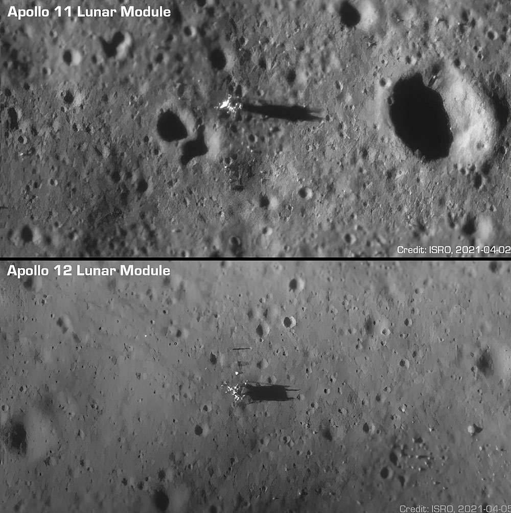 Τα πλάνα αυτά τραβήχτηκαν το 2021 από την αποστολή Chandrayaan-2 του Ινδικού Οργανισμού Διαστημικής Έρευνας η οποία είχε εκτοξευθεί τον Ιούλιο του 2019 και έφθασε τον Αύγουστο του ίδιου έτους σε σεληνιακή τροχιά. Ο δορυφόρος κατάφερε και απαθανάτισε τα σημεία των 2 ιστορικών πρώτων αποστολών της ανθρωπότητας στο φεγγάρι Apollo 11 και Apollo 12, με τις σεληνάκατους να βρίσκονται στα σημεία αυτά από το 1969! Δείτε τις φωτογραφίες που τράβηξε η Orbiter High Resolution Camera (OHRC) του δορυφόρου Chandrayaan-2: