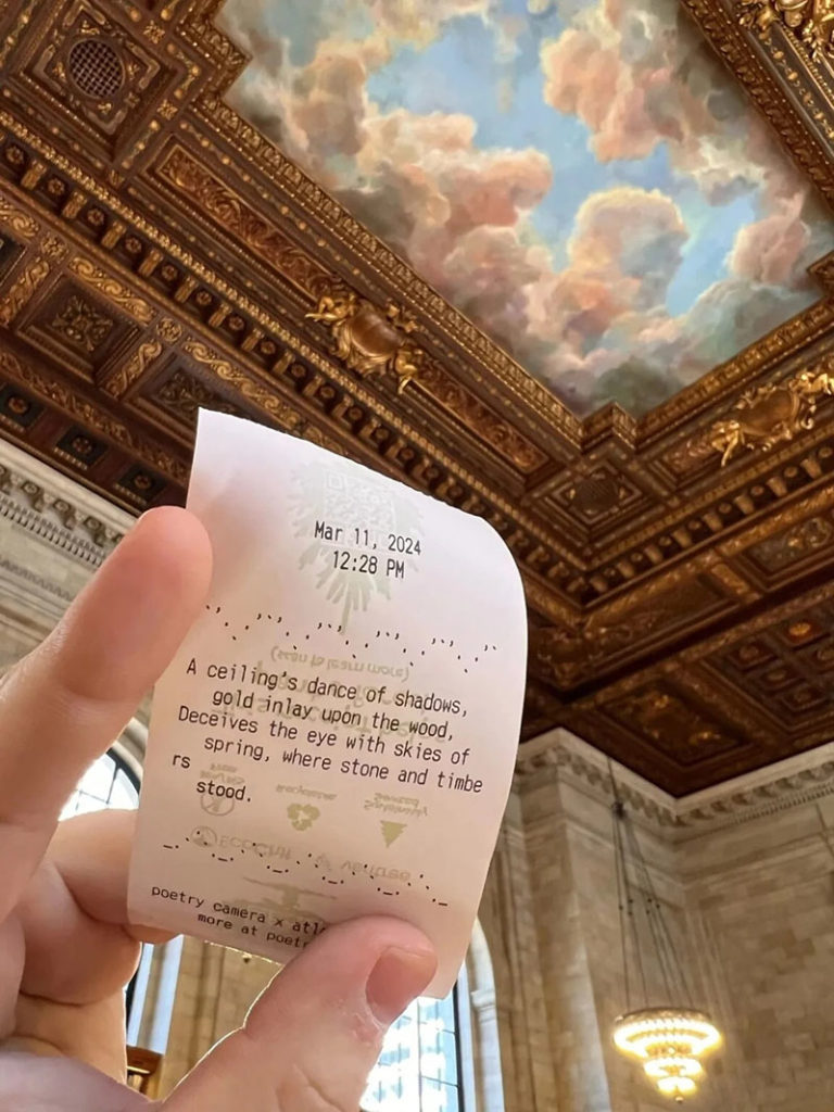 Αν θέλετε να βγάλετε τον ποιητή που έχετε μέσα σας, η Poetry Camera είναι ότι πρέπει! Εξωτερικά μοιάζει με μια κλασική Polaroid. Ωστόσο, λειτουργεί με τεχνητή νοημοσύνη (ΑΙ) και αντί να καταγράφει εικόνες, χρησιμοποιεί μηχανική μάθηση για να μετατρέψει τις φωτογραφίες σε ποιήματα. Πρόκειται για ένα open-source πρότζεκτ (ανοιχτού κώδικα) που δημιουργήθηκε από την Kelin Carolyn Zhang και τον Ryan Mather. Η Poetry Camera αναλύει αυτό που βλέπει και εκτυπώνει ποιήματα με βάση την εκάστοτε σκηνή που έχει μπροστά της. Δείτε το παρακάτω παράδειγμα: