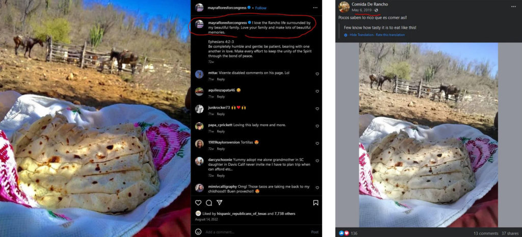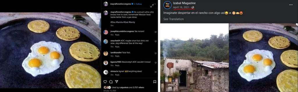 Στην παρακάτω περίπτωση η Flores συνοδεύει τη φωτογραφία φαγητού που έκλεψε με τη λεζάντα “Ως περήφανη Λατίνα που ξέρει να μαγειρεύει, το σπιτικό μεξικάνικο φαγητό έχει καλύτερη γεύση από ότι το μαγείρεμα σε σόμπα αερίου”. Η εν λόγω φωτογραφία εκλάπη από μια ανάρτηση του 2021 από τη σελίδα του περιοδικού Izabal στο Facebook. Και μάλιστα φαίνεται ότι το φαγητό μαγειρεύτηκε σε ξυλόσομπα και όχι σόμπα αερίου.