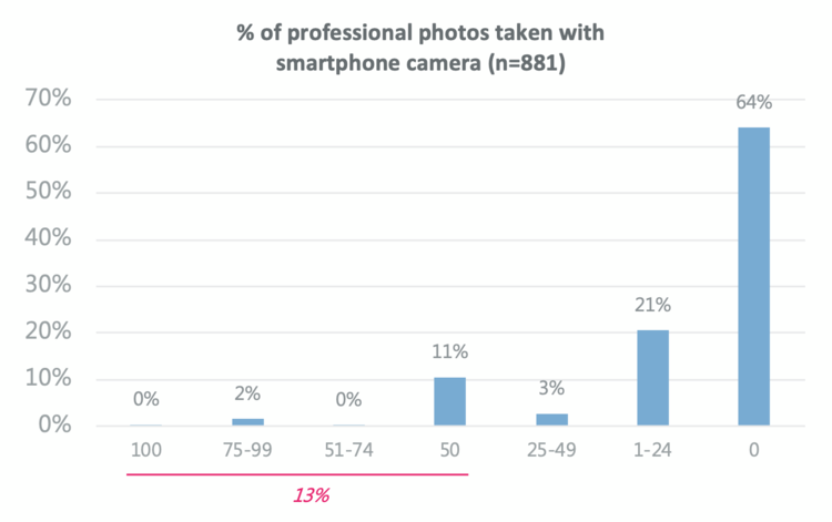 Σύμφωνα με την έρευνα το 11% των επαγγελματιών φωτογράφων βγάζει το 50% των επαγγελματικών φωτογραφιών τους με smartphone, με ένα 2% να το κάνει σε ποσοστό 75-99%.