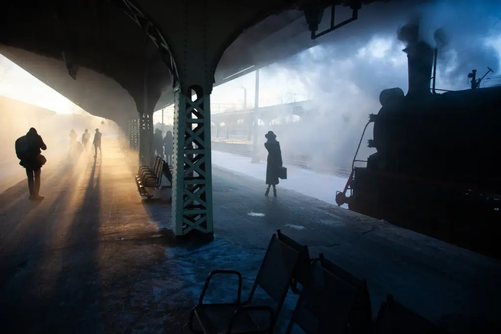 Ένα στιγμιότυπο στο σιδηροδρομικό σταθμό με φόντο ένα ρετρό τρένο.