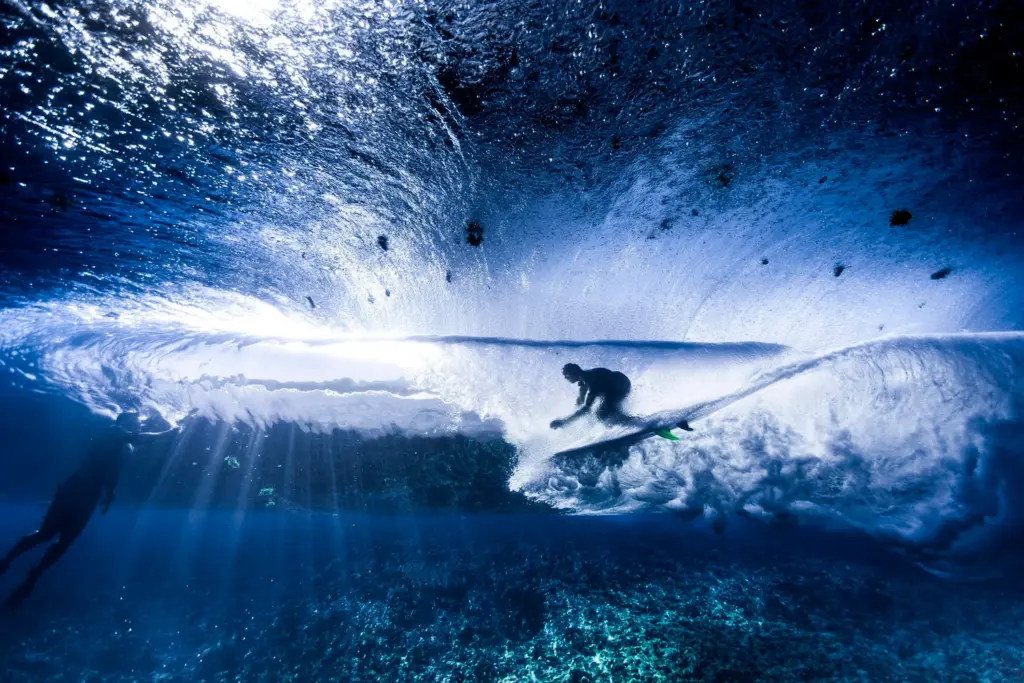 Ένας σέρφερ και ένας παρατηρητής μοιράζονται μια υποβρύχια στιγμή στη Γαλλική Πολυνησία.