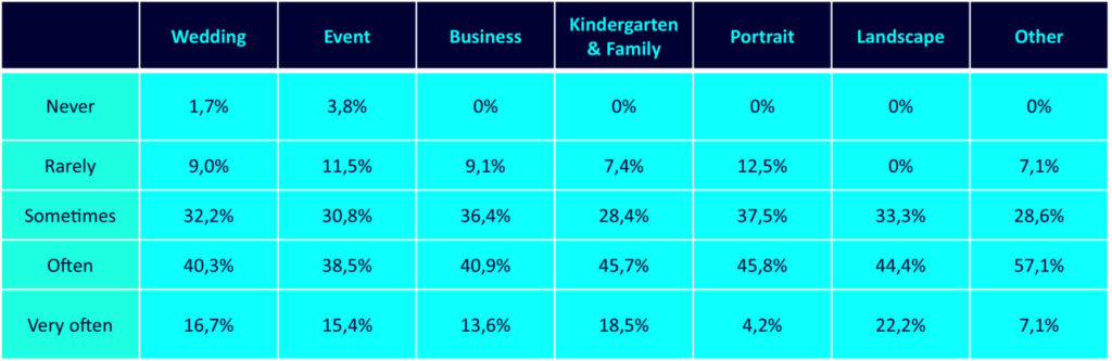 Η μελέτη ανέδειξε πως ο χρόνος που δαπανάται για την επεξεργασία εξαρτάται από το είδος της φωτογραφίας. Για παράδειγμα, περίπου το ένα τέταρτο των φωτογράφων γάμων ξοδεύει 10-20 ώρες την εβδομάδα, ενώ το 20% αφιερώνει περισσότερες από 20 ώρες. Οι φωτογράφοι τοπίων αναδεικνύονται ως εκείνοι με τη μεγαλύτερη αναλογία, καθώς το 22,2% ξοδεύει πάνω από 20 ώρες την εβδομάδα στην επεξεργασία.