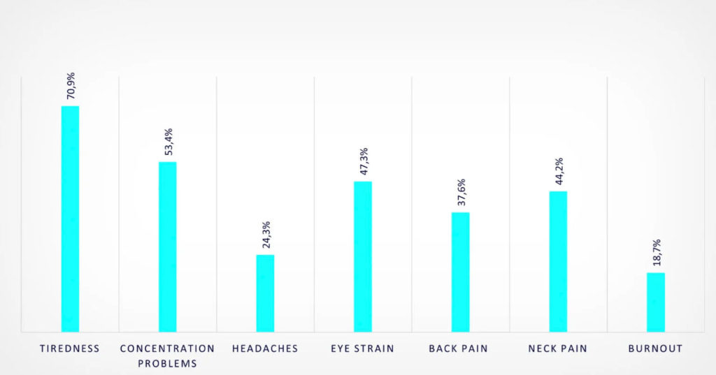 Η εργασία μπροστά από τον υπολογιστή για πολλές ώρες μπορεί να οδηγήσει σε προβλήματα υγείας. Το 70,9% των συμμετεχόντων ανέφεραν κόπωση ως το κύριο ζήτημα, ακολουθούμενο από προβλήματα συγκέντρωσης (53,4%), κόπωση στα μάτια (47,3%) και πόνο στον αυχένα (44,2%). Επίσης, το 37,6% αναφέρει πόνο στην πλάτη και το 24,3% πονοκεφάλους.