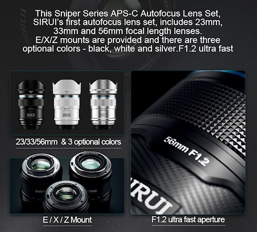 Εκτός από τους αναμορφικούς κινηματογραφικούς φακούς της, η Sirui αποφάσισε να λανσάρει μια νέα σειρά προσιτών σταθερών φακών με αυτόματη εστίαση (για πρώτη φορά) και είναι οι εξής: Sirui Sniper 23mm f/1.2, 33mm f/1.2 και 56mm f/1.2, οι οποίοι είναι σχεδιασμένοι για συστήματα Sony E, Fujifilm X και Nikon Z και είναι διαθέσιμοι σε άσπρο (white ceramic), μαύρο (black carbon) και ασημί χρώμα (silver aluminum). Κάθε ένας από τους φακούς ζυγίζει από 381 έως 400 γραμμάρια (ανάλογα την έκδοση) και στο μπροστινό μέρος δέχονται όλοι φίλτρα 58mm. Η ελάχιστη απόσταση εστίασης είναι 30 εκατοστά για τον Sirui Sniper 23mm f/1.2, 40 εκατοστά για τον Sirui Sniper 33mm f/1.2 και 60 εκατοστά για τον Sirui Sniper 56mm f/1.2.