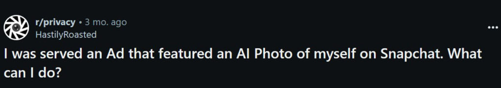 Όταν τραβήξετε selfies και τις ανεβάσετε, το Snapchat χρησιμοποιεί αυτές τις εικόνες για να αναλύσει τα χαρακτηριστικά του προσώπου σας προκειμένου να κάνετε χρήση των AI εργαλείων (τεχνητής νοημοσύνης). Ωστόσο, το Snapchat διατηρεί το δικαίωμα να τοποθετεί το πρόσωπό σας (μέσω του My Selfie) σε διαφημίσεις. Ένας χρήστης του Reddit αναφέρει ένα τέτοιο χειροπιαστό περιστατικό όπου είδε το πρόσωπό του σε διαφήμιση!