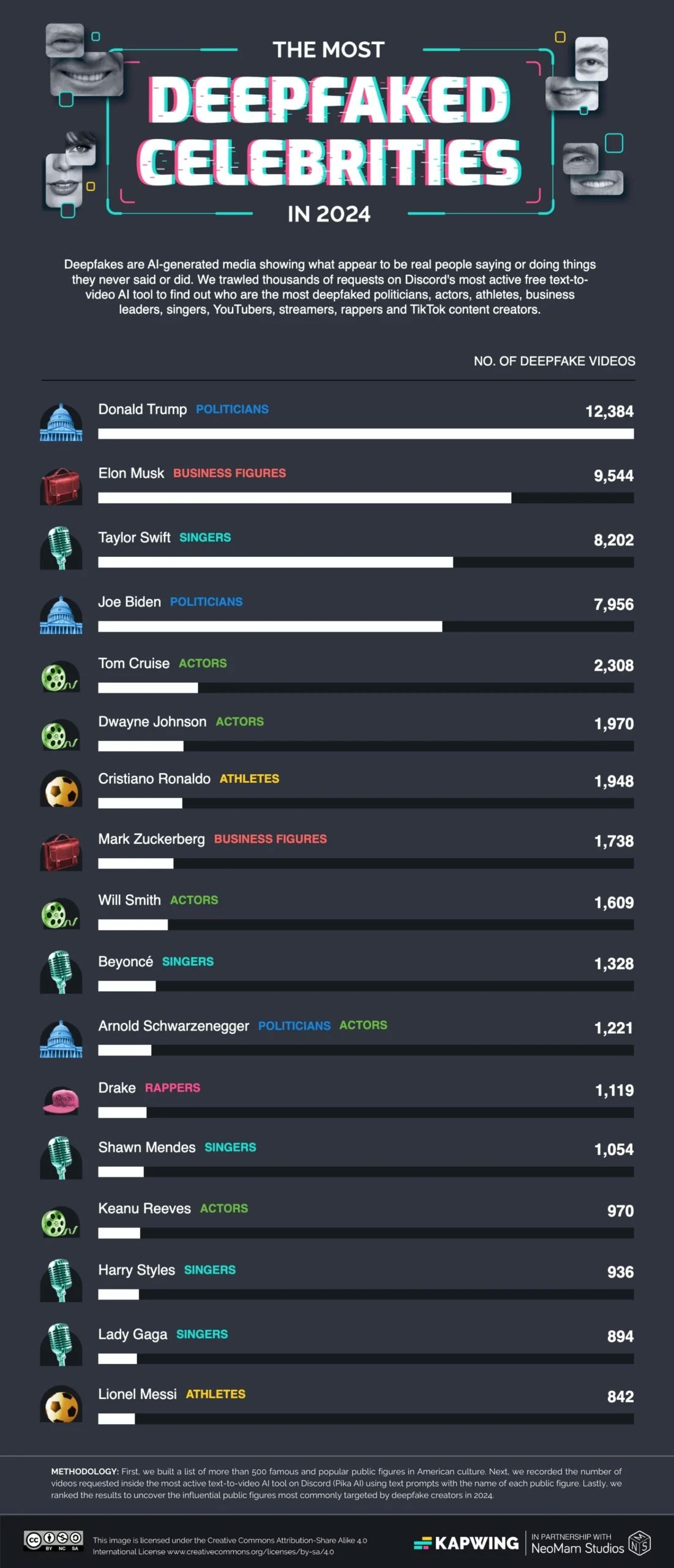 Σύμφωνα με μια νέα μελέτη από την Kapwing, η οποία επικεντρώνεται στο φαινόμενο των deepfake, οι δημόσιοι χαρακτήρες που έχουν χρησιμοποιηθεί σε Deepfake βίντεο για 2024 περιλαμβάνουν τους Ντόναλντ Τραμπ και Τέιλορ Σουίφτ.