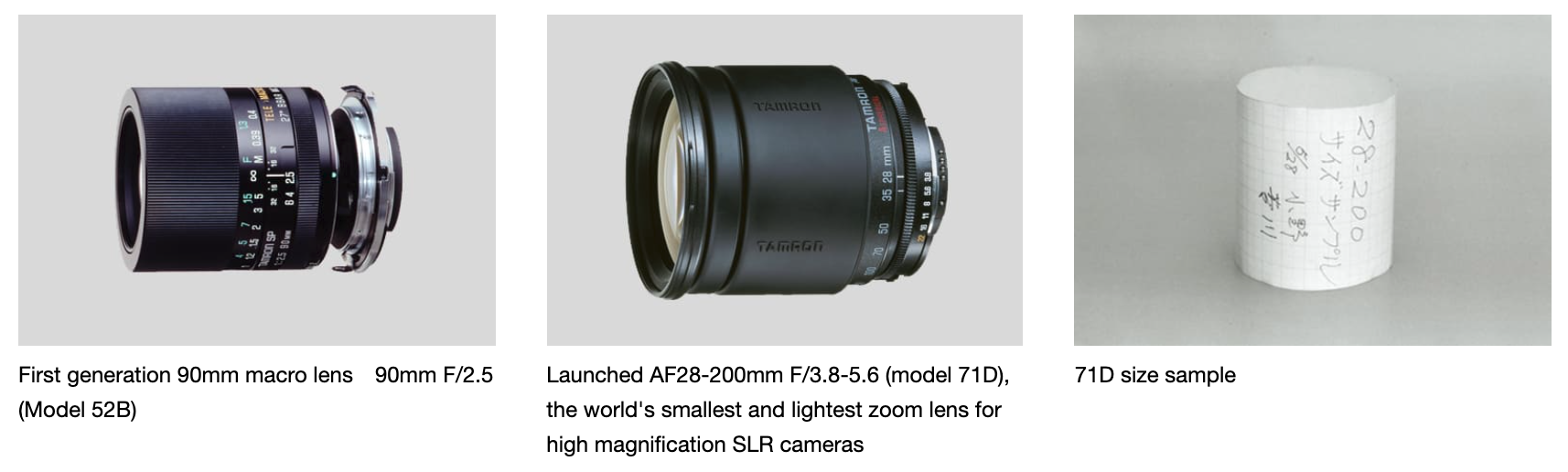 Το 1992, η Tamron κυκλοφόρησε τον ζουμ φακό all-in-one 28-200mm F / 3.5-5.6 Aspherical (Model 71D), ο οποίος θα μπορούσε να χαρακτηριστεί ως το χαρακτηριστικό προϊόν της Tamron. Ενώ οι φακοί all-in-one-zoom ήταν ήδη διαθέσιμοι στην αγορά, ο όγκος τους δεν τους έκανε ευέλικτους και η Tamron αποφάσισε να αναπτύξει έναν συμπαγή ζουμ φακό all-in-one που ήταν μικρός και ελαφρύς. Η προσπάθεια ανάπτυξης ξεκίνησε από τον πρώην πρόεδρο Morio Ono, ο οποίος ήταν διευθυντής στο τμήμα βίντεο εκείνη την εποχή, όταν η σύζυγός του δεν μπόρεσε να βγάλει καλές φωτογραφίες στην τελετή αποφοίτησης του γιου τους. Ο Ono, που δεν μπόρεσε να παρευρεθεί, έστειλε στη γυναίκα του με έναν τηλεφακό ζουμ και της δίδαξε πώς να αλλάζει φακούς. Αλλά η αρχάρια σύζυγός του δυσκολεύτηκε να αλλάξει τους φακούς και ως εκ τούτου απέτυχε να πάρει τα πλάνα. Σε απάντηση, η Tamron ανέπτυξε και κατασκευάζει έναν ευέλικτο και συμπαγή φακό ζουμ all-in-one που είναι μικρός και ελαφρύς, και που διαθέτει υψηλή απόδοση και εξαιρετική ποιότητα εικόνας. Ο φακός Model 71D είχε πολύ καλή φήμη στο εξωτερικό και τελικά έγινε πολύ δημοφιλής και στην Ιαπωνία.