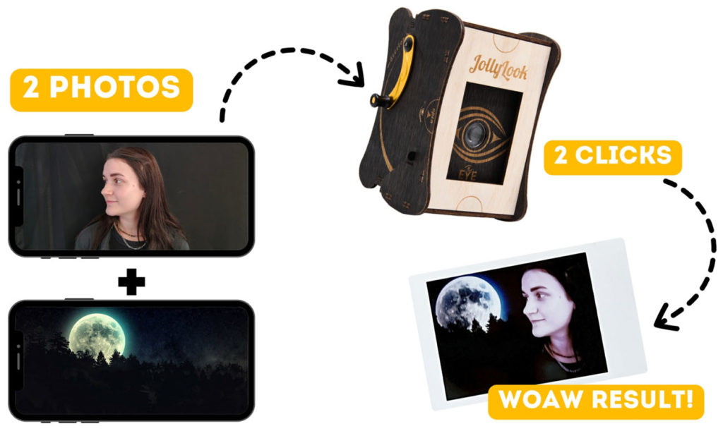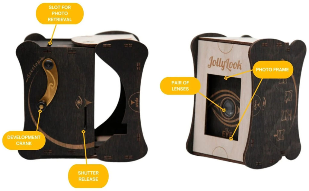 Το νέο Jollylook Eye χρησιμοποιεί φιλμ (τύπου instant), αλλά υπάρχει μια πρωτοτυπία. Αντί να βασίζεται σε ψηφιακή σύνδεση μεταξύ του εκτυπωτή και ενός smartphone, χρησιμοποιεί τα δικά του οπτικά μέρη για να εκθέσει το στιγμιαίο φιλμ σε μια οθόνη smartphone και να εκτυπώσει το αποτέλεσμα. Σκοπός της εταιρίας είναι να σας χαρίσει μια πιο “αναλογική” εμπειρία. Εμφανισιακά μοιάζει με ένα συμπαγές κουτί που όταν ξεδιπλωθεί έχει διαστάσεις 16 x 11.4 x 11 εκατοστά και βάρος 1 κιλό. Εκτός από τους φακούς, η Jollylook λέει ότι ολόκληρο το κουτί είναι κατασκευασμένο από φυσικό βιοδιασπώμενο υλικό από ίνες ξύλου για να είναι φιλικό προς το περιβάλλον.