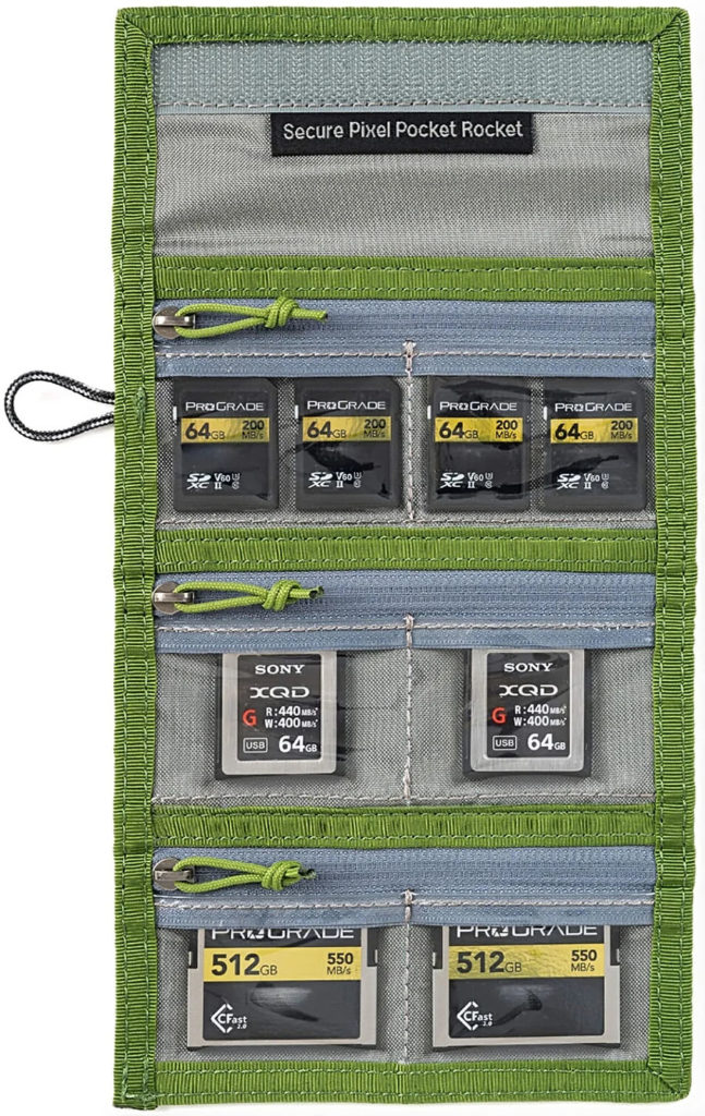 Οι θήκες-πορτοφόλια καρτών μνήμης Pixel Pocket Rocket V2 (και mini) διατίθενται σε 9 μεγέθη (ανάλογα με το πόσες κάρτες διαθέτετε) και έχουν σχεδιαστεί με γνώμονα τις πιο πρόσφατες μορφές καρτών μνήμης, όπως οι κάρτες CFexpress Type A και Type B. Για παράδειγμα, η θήκη Secure Pixel Pocket Rocket V2 χωράει 6 κάρτες τύπου CFast ή CFexpress Type B ή 12 κάρτες μνήμης SD ή CFexpress Type A. Έχει προστεθεί και ένα μέγεθος το Secure Pixel Pocket Mini, το οποίο χωράει 4 κάρτες CFast ή CFexpress Type B ή 6 κάρτες SD ή CFexpres Type A.