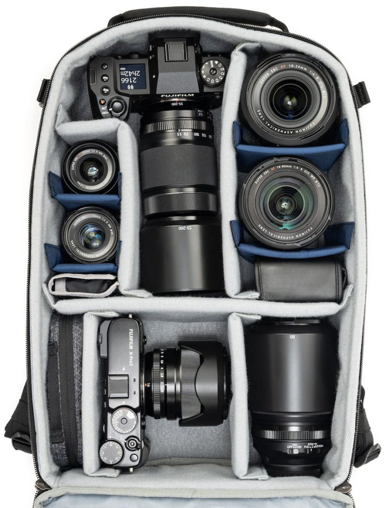 Χωράνε άνετα 2 σώματα (με φακό επάνω) και αρκετούς πρόσθετους φακούς αλλά και αξεσουάρ όπως φλας, φίλτρα, έξτρα μπαταρίες κλπ. Στο μπροστινό μέρος διαθέτουν μια μεγάλη τσέπη χωρητικότητας 5 λίτρων με μαγνητικό μηχανισμό κουμπώματος (με φερμουάρ ασφαλείας) για να κουβαλάτε έξτρα πράγματα, ενώ υπάρχει μια επιπλέον θήκη και για συσκευές όπως tablet και laptop (μέχρι 14 ιντσών τα χωράει άνετα). Εσωτερικά διαθέτει διαχωριστικά μαξιλαράκια που μπορείτε να τα προσαρμόσετε όπως θέλετε ανάλογα τον εξοπλισμό σας.