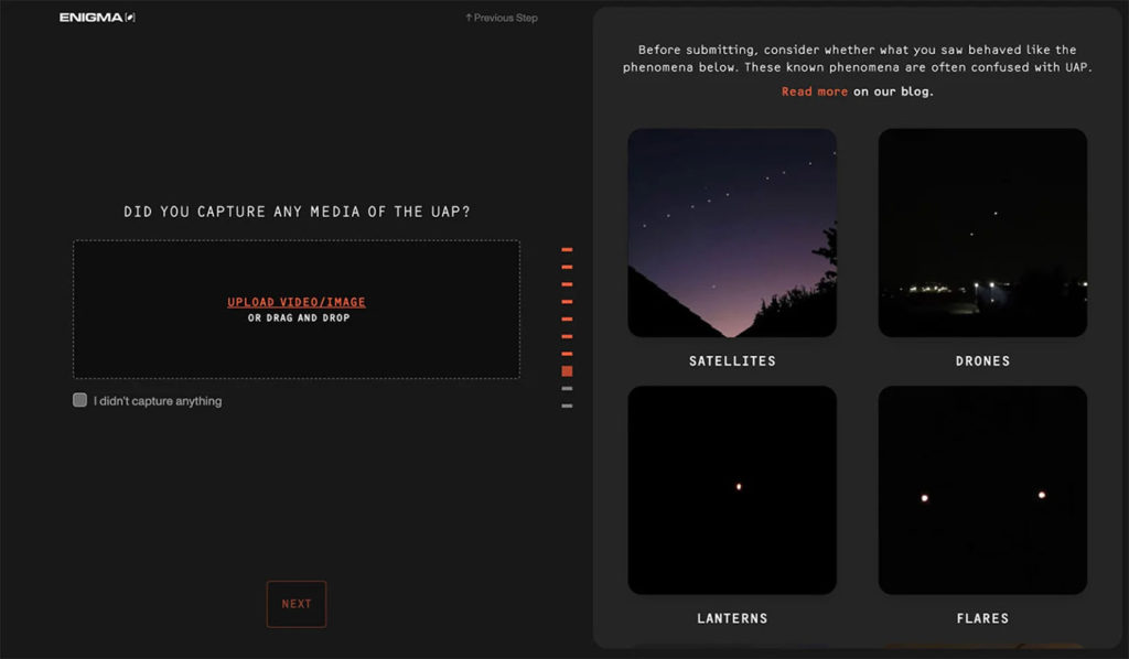 Σύμφωνα με τα λεγόμενα της Enigma Labs, η εταιρία ελπίζει να διώξει το “στίγμα” από όλους όσους αναφέρουν περίεργες λάμψεις ή αντικείμενα στον ουρανό. Μπορείτε πλέον να ανεβάσετε το υλικό σας ενώ περιγράφετε τι είδατε και μπορείτε να καταγράψετε και λεπτομέρειες σχετικά με την ώρα, την τοποθεσία, τη διάρκεια του φαινομένου και άλλα. Η εφαρμογή αναλύει τις φωτογραφίες και τα βίντεο που ανεβαίνουν χρησιμοποιώντας μηχανική εκμάθηση, προσπαθώντας να εντοπίσει εάν μια εικόνα έχει υποστεί επεξεργασία (μέσω Photoshop για παράδειγμα) ή αν έχει πειραχτεί γενικά.