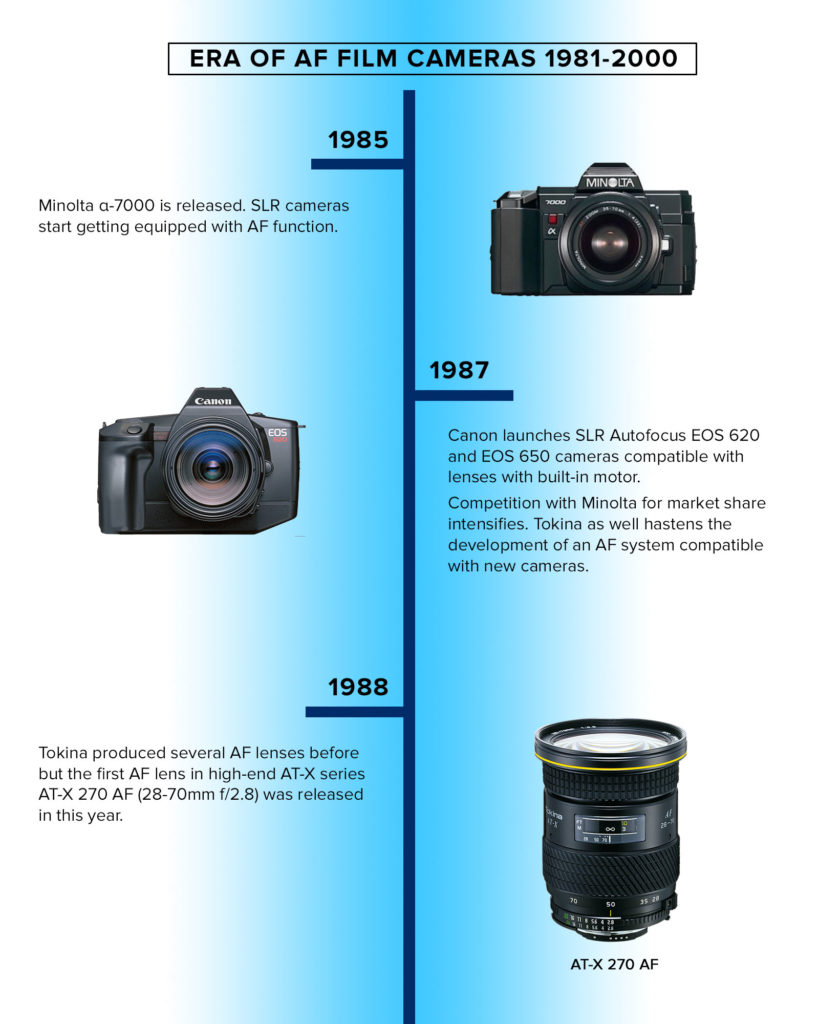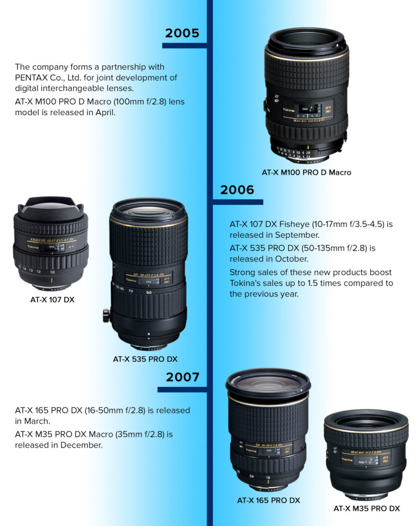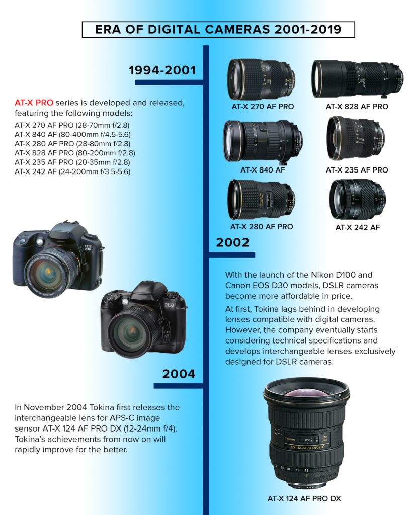 Μπαίνοντας στη δεκαετία του 2000, η ψηφιακή επανάσταση επρόκειτο να ξεσπάσει. Ενώ οι πρώτες ψηφιακές κάμερες SLR ήταν υπερβολικά ακριβές, η Canon EOS D60 (κυκλοφόρησε το 2000) και η Nikon D100 (κυκλοφόρησε το 2002) έκαναν τη φωτογραφία πιο προσιτή τόσο για τους ερασιτέχνες όσο και για τους επαγγελματίες φωτογράφους. Η Tokina άρχισε αργά αλλά σταθερά να εξετάζει βασικές τεχνικές προδιαγραφές και να αναπτύσσει εναλλάξιμους φακούς αποκλειστικά σχεδιασμένους για κάμερες DSLR.