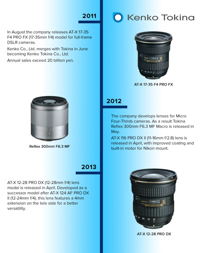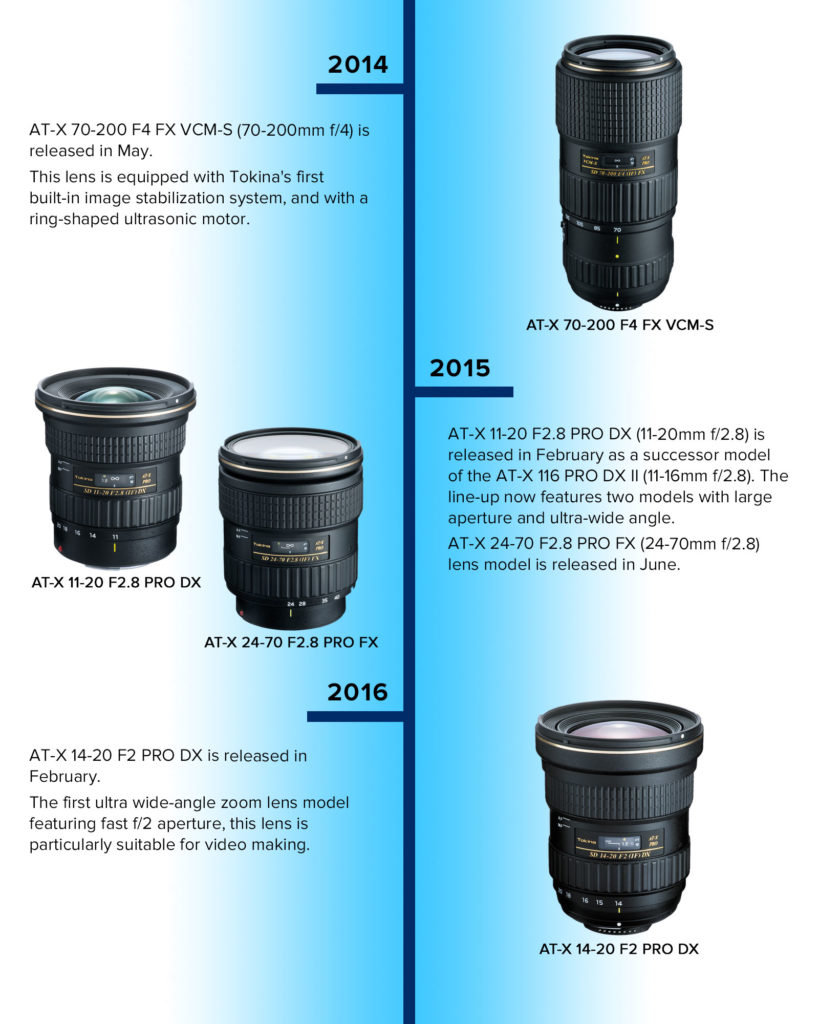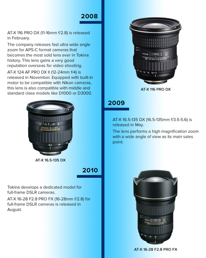 Ενώ ο παραπάνω AT-X 124 AF PRO DX υπήρξε πραγματικά ένας θρυλικός φακός μεταξύ των φωτογράφων, ωστόσο, ένας άλλος θρυλικός φακός Tokina που συνέβαλε πάρα πολύ στην παγκοσμιοποίηση της μάρκας Tokina ήταν ο AT-X 116 PRO DX (11-16mm f / 2.8), ο οποίος κυκλοφόρησε το 2008 και τελικά αναγνωρίστηκε παγκοσμίως μεταξύ των βιντεογράφων.