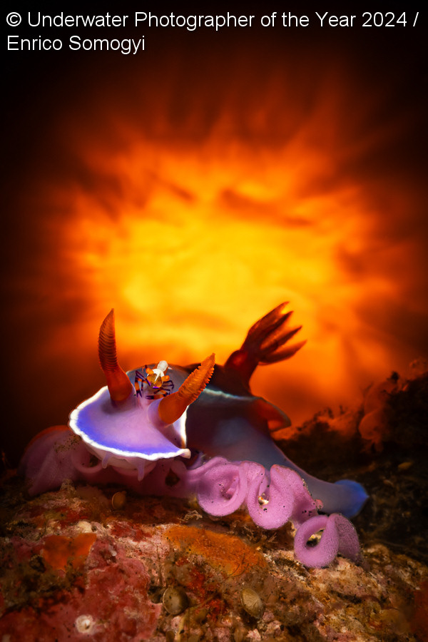 Αυτή η φωτογραφία ενός γυμνού κλαδιού (Hypsolodoris apolegma) με μια αυτοκρατορική γαρίδα στο κεφάλι τραβήχτηκε στο Tulamben. Για να δημιουργήσω το φόντο που μοιάζει με φωτιά, έφτιαξα ένα ειδικό εργαλείο που μου πήρε πολύ χρόνο για να το βάλω σε λειτουργία. Αλλά στο τέλος πήρα την εικόνα που έψαχνα.