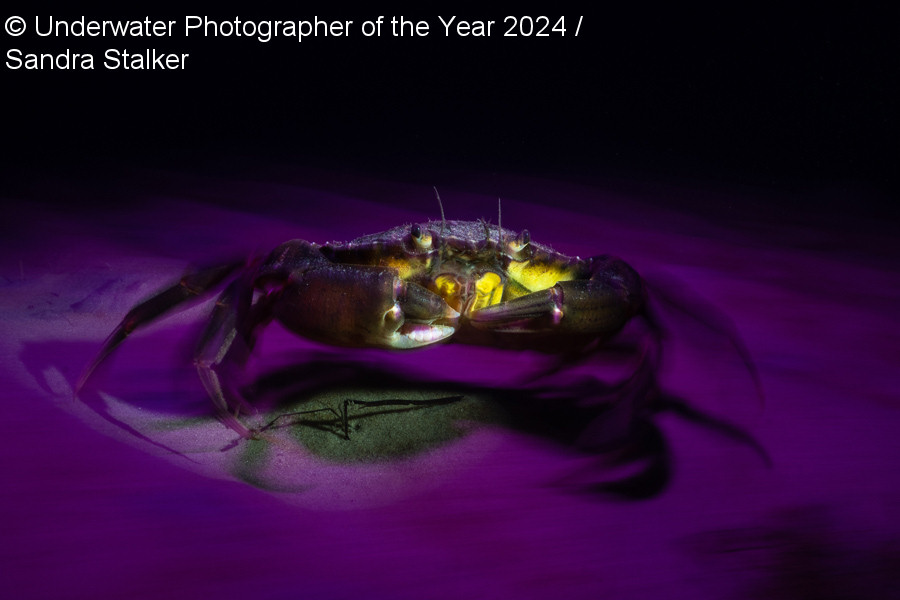 Τράβηξα αυτή τη λήψη σε μια νυχτερινή κατάδυση στην τοπική μου τοποθεσία κατάδυσης. Είχα επιχειρήσει προηγουμένως αυτή τη λήψη σε μερικές καταδύσεις και δεν είχα πετύχει αυτό που ήθελα μέχρι αυτήν την κατάδυση. Θεωρώ ότι τα καβούρια έχουν τόσο τολμηρούς και αστείους χαρακτήρες ενώ τρέχουν προς το μέρος μου και στη συνέχεια φεύγουν και ήθελα να συλλάβω αυτόν τον χαρακτήρα. Το καβούρι δεν ξεχώριζε πολύ από την άμμο, γι’ αυτό χρησιμοποίησα ένα μωβ φως σε έναν φακό για το πίσω μέρος και μετά φώτισα το καβούρι με λευκό φως από φλας, παρακολουθώντας το καθώς έτρεχε στον βυθό για τη μακροχρόνια έκθεση . Αυτό έκανε μια υπέροχη αντίθεση του πράσινου του καβουριού με το μωβ, με το καβούρι να κοιτάζει απευθείας την κάμερα.