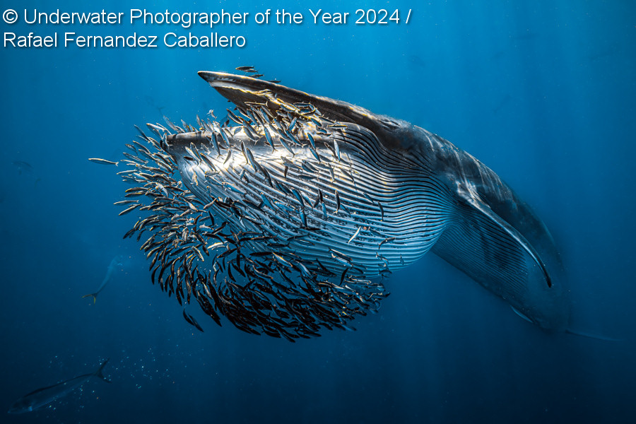 Είχα την τύχη να ζήσω αυτό το μοναδικό θέαμα στα ανοιχτά νερά του Ειρηνικού στον κόλπο Magdalena στα τέλη του 2023. Λόγω του θερμότερου νερού φέτος που προκλήθηκε από το κλιματικό φαινόμενο «El Niño», περισσότερα είδη από ποτέ εντάχθηκαν σε αυτό το κυνήγι. Τα Bait balls από σαρδέλες προσέλκυσαν μια ποικιλία αρπακτικών, αλλά τα κύρια αστέρια της σειράς, που επισκέφθηκαν την Baja ίσως σε μεγαλύτερους αριθμούς από ποτέ, ήταν οι φάλαινες του Bryde. Περιπολούσαν στα νερά, ψάχνοντας για Bait balls για να γεμίσουν την κοιλιά τους με εκατοντάδες κιλά ψάρια. Αυτή η φωτογραφία δείχνει την στιγμή της επίθεσης, με τις κοιλιακές πτυχές της φάλαινας ορθάνοιχτες να φιλτράρουν το θήραμα από το νερό χρησιμοποιώντας τα Bait balls, αφού έφαγαν εκατοντάδες κιλά σαρδέλας σε μια μπουκιά – απλά αξέχαστη.