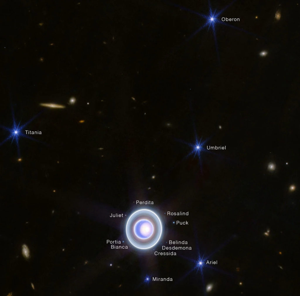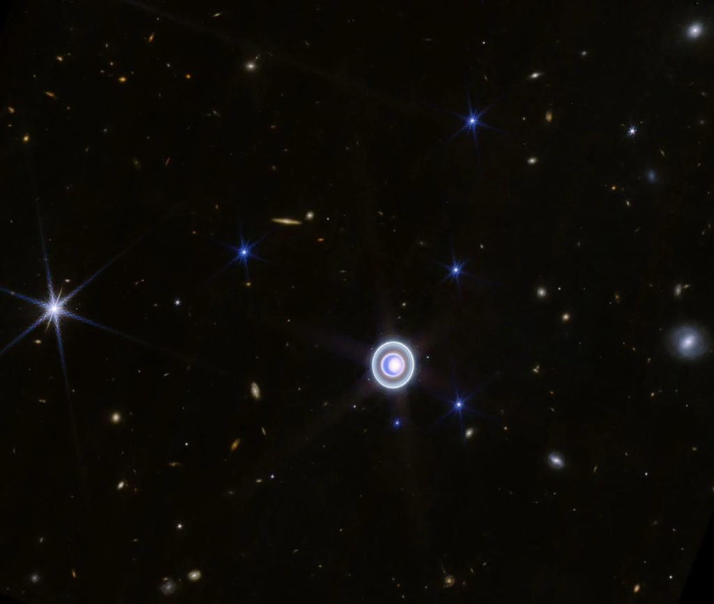 Δεν είναι η πρώτη φορά που φωτογραφίζει τον εν λόγω πλανήτη το ισχυρό τηλεσκόπιο, αλλά αυτή τη φορά τράβηξε μια φωτογραφία όπου οι δακτύλιοι σκόνης εμφανίζονται με εντυπωσιακή λεπτομέρεια. Εκτός από τους δακτυλίους, το Webb κατέγραψε επίσης πολλά από τα 27 γνωστά φεγγάρια του πλανήτη. Σε αυτή την εικόνα, ο Ουρανός εμφανίζεται με μια μπλε απόχρωση η οποία οφείλεται στο γεγονός ότι η φωτογραφία δημιουργήθηκε με συνδυασμό δεδομένων από την κάμερα υπερύθρων NIRCam (Near-Infrared Camera) η οποία καταγράφει εικόνες στο κοντινό υπέρυθρο φάσμα. Οι αμυδροί εσωτερικοί και εξωτερικοί δακτύλιοι του Ουρανού είναι επίσης ορατοί σε αυτήν την εικόνα, συμπεριλαμβανομένου του ιδιαίτερου δακτυλίου Ζήτα, που είναι ένας εξαιρετικά αχνός και διάχυτος δακτύλιος που βρίσκεται πιο κοντά στον πλανήτη.