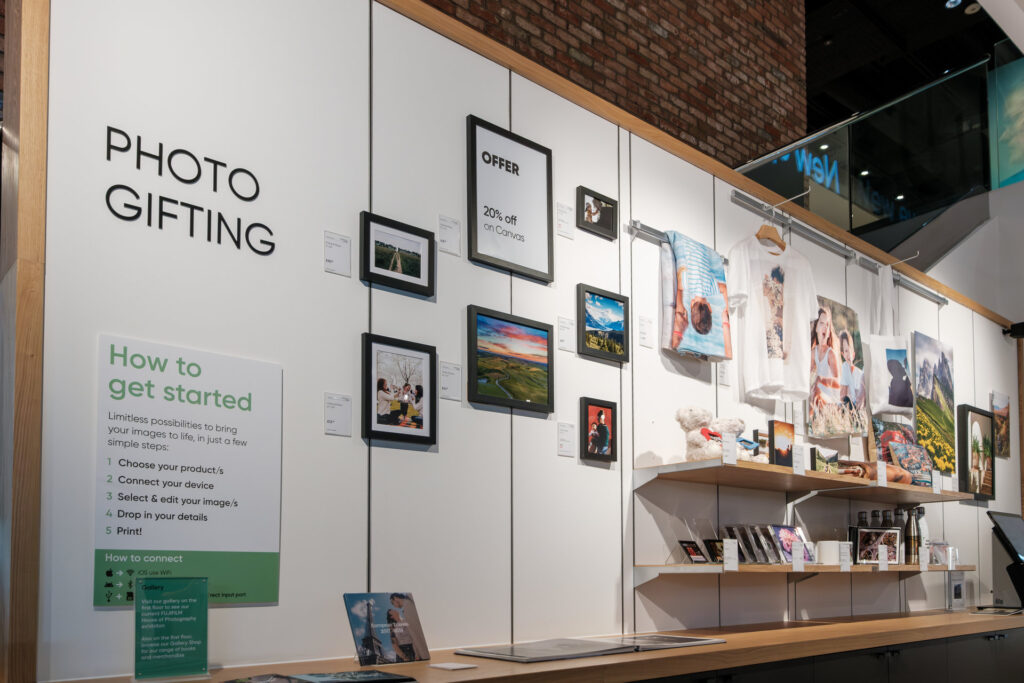 Ο επάνω όροφος είναι ένας όμορφα διαμορφωμένος χώρος που παρουσιάζει δουλειές φωτογράφων που χρησιμοποιούν εξοπλισμό Fujifilm, αποδεικνύοντας την υψηλή ποιότητα εκτυπώσεων που μπορείς να πετύχεις με την τεχνολογία τους.