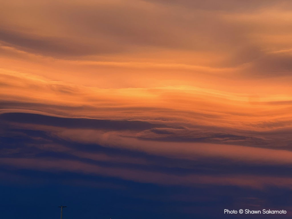 Οι ζεστοί, ξηροί άνεμοι μπορούν επίσης να δημιουργήσουν εντυπωσιακές δομές σύννεφων, όπως το «τόξο Chinook»—μια σταθερή ζώνη σύννεφων λόγω συμπύκνωσης στην κορυφή και την πλευρά προς τον άνεμο της οροσειράς — το οποίο αποτύπωσε ο Shawn κοντά στο Pincher Creek, στην Αλμπέρτα του Καναδά, την παραδοσιακή περιοχή των Ιθαγενών Blackfoot.