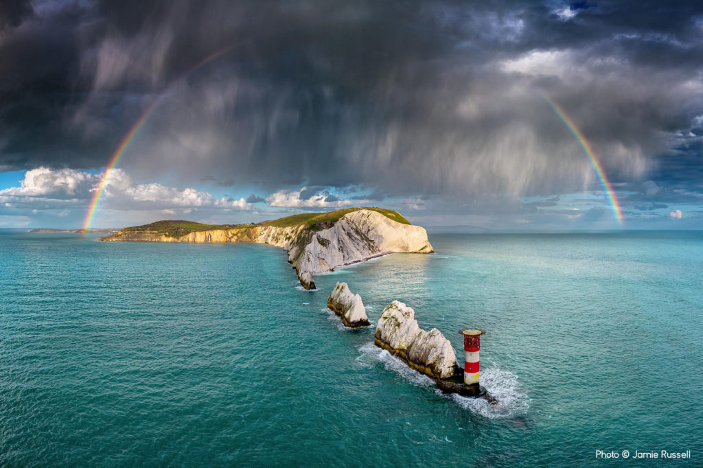 Ο φωτογράφος Jamie Russell εκμεταλλεύτηκε τη θάλασσα και τον αέρα για να αποτυπώσει αυτή την εικόνα: «Μερικά μεγάλα σύννεφα βροχής άρχισαν να αναπτύσσονται περίπου 20 μίλια βόρεια-βορειοδυτικά μας. Καταλάβαμε ότι θα μπορούσαν να διασχίσουν τα The Needles με την πιθανότητα να δημιουργηθεί ουράνιο τόξο, οπότε πήραμε το φουσκωτό μας από τον κόλπο Colwell και τοποθετηθήκαμε με την κάμερα. Ωστόσο, η σύνθεση ήταν δύσκολη και η θαλασσοταραχή ήταν πρόκληση, οπότε ανέβασα το drone, γνωρίζοντας ότι η θέα πιθανόν να ήταν πολύ πιο εντυπωσιακή». Το ένστικτό του απέδωσε καρπούς, καθώς κατάφερε να αποτυπώσει δύο βρετανικά εμβλήματα: τους λευκούς λοφους των The Needles και μια ξαφνική μπόρα! Στην κορυφή της εικόνας δεσπόζει ένα ουράνιο τόξο, στεφανώνοντας τέλεια το Isle of Wight.