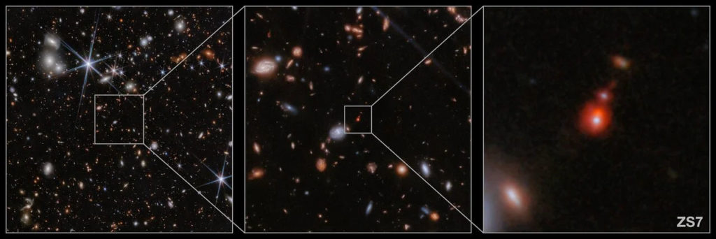 Οι υπερμεγέθεις μαύρες τρύπες που έχουν ανακαλύψει οι επιστήμονες τα τελευταία χρόνια έχουν μάζες εκατομμύρια ή και δισεκατομμύρια φορές μεγαλύτερες από τη μάζα του Ήλιου μας. Αυτές οι μαύρες τρύπες πιθανότατα παίζουν σημαντικό ρόλο στην εξέλιξη των γαλαξιών στους οποίους εδρεύουν. Η ανακάλυψη γιγάντιων μαύρων τρυπών που σχηματίστηκαν τα πρώτα δισεκατομμύρια χρόνια μετά τη Μεγάλη Έκρηξη δείχνει ότι ανάπτυξη τους πρέπει να συνέβη πολύ γρήγορα και πολύ νωρίς. Οι νέες παρατηρήσεις του James Webb αποκαλύπτουν την πιο μακρινή συγχώνευση γαλαξιών και μαύρων τρυπών. Το γαλαξιακό αυτό σύστημα έχει ονομασία ZS7.