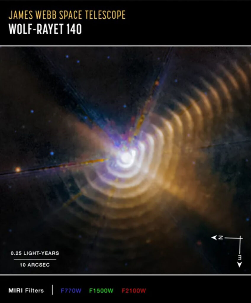 Πρόκειται για ένα σύστημα που ονομάζεται WR 140 και αποτελείται από 2 τεράστια άστρα τα οποία σύμφωνα με τους αστρονόμους αναμένεται να οδηγηθούν σε σουπερνόβα (εκρήξεις στο τελευταίο στάδιο της ζωής των άστρων). Βρίσκεται στον αστερισμό του Κύκνου σε απόσταση 5.000 ετών φωτός από εμάς. Ένα από τα άστρα είναι ένα μεγαθήριο τύπου Ο που σημαίνει ότι το άστρο έχει τη μέγιστη δυνατή φωτεινότητα, θερμοκρασία και με ισχυρούς ανέμους ακτινοβολίας (αυτό συμβαίνει διότι είναι στο τελευταίο στάδιο της ζωής του πριν την έκρηξη σουπερνόβα). Το δεύτερο άστρο σύμφωνα με τους ειδικούς είναι ένα άστρο Wolf–Rayet (WR). Αυτού του είδους τα άστρα είναι επίσης ογκώδη, αλλά προς το τέλος της ζωής τους αποκτούν μια ιδιαίτερη “ταραχώδη” συμπεριφορά καθώς οδηγούνται σε γρήγορη αποβολή μάζας που συμβαίνει με έντονες εκρήξεις αποκαλύπτοντας τελικά το εσωτερικό τους. Η λήψη έγινε στο μεσαίο υπέρυθρο φάσμα χάρη στο όργανο απεικόνισης MIRI του Webb (Mid-Infrared Instrument):