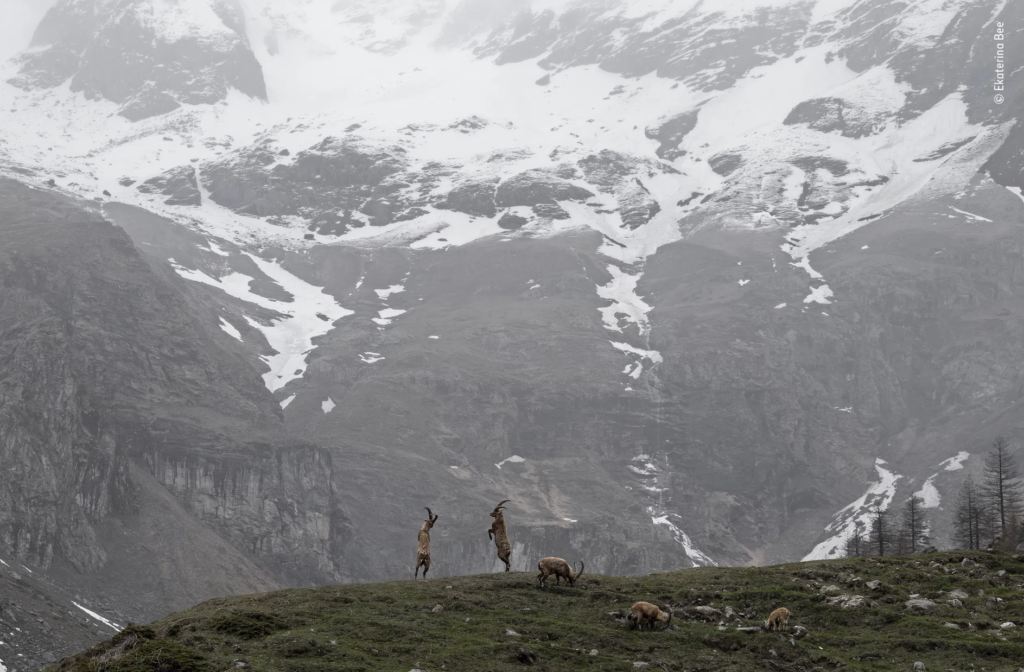 Η Ekaterina Bee (Ιταλία) παρακολουθεί δύο Αλπικούς αγριοκάτσικους στην μάχη τους για υπεροχή. Ήταν κοντά στο τέλος μιας ανοιξιάτικης ημερήσιας εκδρομής με την οικογένειά της που η Ekaterina εντόπισε τον καβγά. Τα δύο αγριοκάτσικα συγκρούστηκαν με κέρατα και συνέχισαν να ανταλλάσσουν χτυπήματα ενώ στέκονταν στα πίσω τους πόδια, σαν μπόξερ σε ρινγκ.
