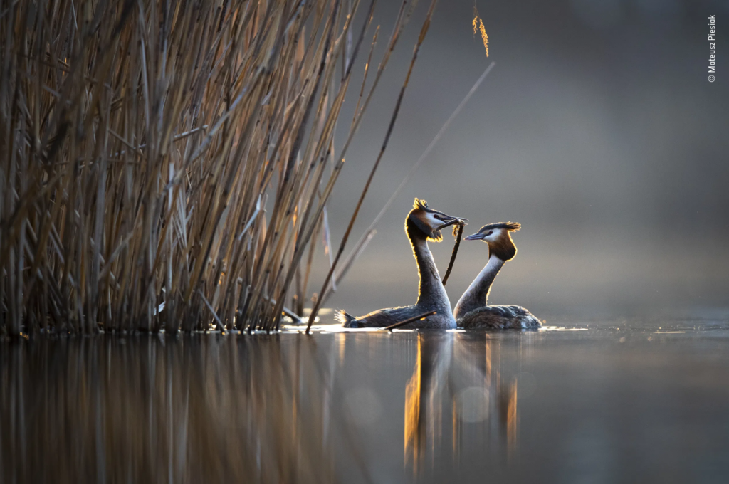 Ο Mateusz Piesiak (Πολωνία) εξέτασε προσεκτικά τις γωνίες της κάμερας για να δημιουργήσει μια σειρά οικείων φωτογραφιών που εξερευνούν τη συμπεριφορά των πουλιών. Με την ανατολή του ηλίου, ένα ζευγάρι Σκουφοβουτηχτάρια με αναπαραγωγικό φτέρωμα ξεκινούν να ερωτοτροπούν με την παροχή δώρου. Το αρσενικό προσφέρει στο θηλυκό μια κορδέλα από υδρόχορτο, ξεκινώντας μια σειρά από συγχρονισμένες, τελετουργικές κινήσεις.