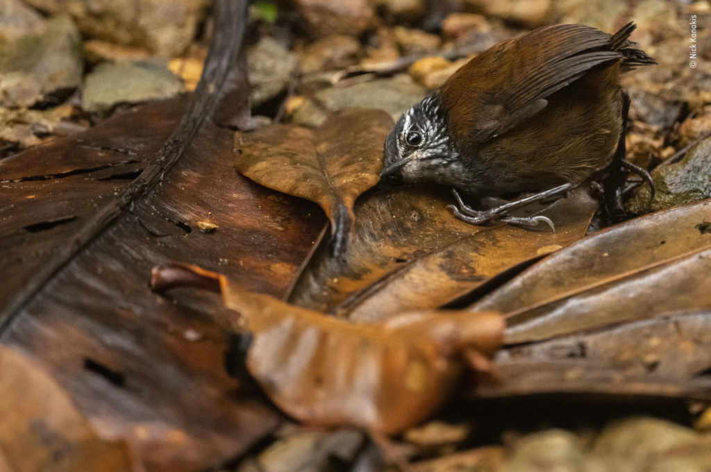 Ο Nick Kanakis (ΗΠΑ) αποκτά μια ματιά στη μυστική ζωή των Wrens. Ο Νικ εντόπισε αυτό το νεαρό άτομο που αναζητούσε τροφή. Γνωρίζοντας ότι θα εξαφανιζόταν στο δάσος αν το πλησίαζαν, βρήκε ένα καθαρό μέρος με φύλλα και περίμενε να του έρθει. Φυσικά, το πουλάκι πήδηξε στο κάδρο, πιέζοντας το αυτί του στο έδαφος για να ακούσει για μικρά έντομα.