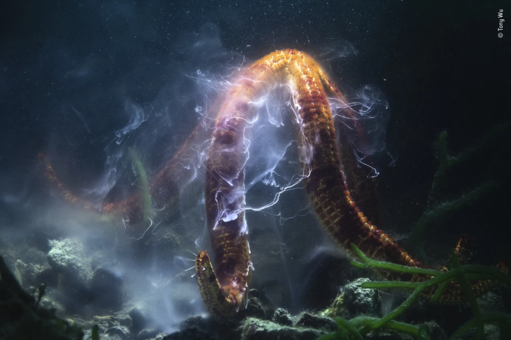 Ο Tony Wu (ΗΠΑ/Ιαπωνία) παρακολουθεί τον ηλεκτρισμένο αναπαραγωγικό χορό ενός γιγάντιου αστεριού της θάλασσας. Καθώς το περιβάλλον νερό γέμιζε με σπέρμα και ωάρια από θαλάσσια αστέρια που γεννούσαν, ο Tony αντιμετώπισε αρκετές προκλήσεις. Καθηλωμένος σε έναν μικρό, κλειστό κόλπο με μόνο έναν μακρο φακό για τη φωτογράφιση μικρών θεμάτων, έκανε προς τα πίσω για να χωρέσει στο κάδρο το κυματιστό θαλάσσιο αστέρι στο οπτικό του πεδίο σε αυτή τη σκηνή που μοιάζει με γαλαξία.