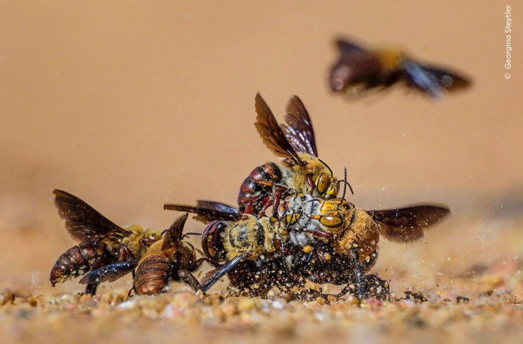 Μια δράση όπου πέντε κόκκινες και κίτρινες μέλισσες αγωνίζονται να αρπάξουν μια μεγαλύτερη ασημένια μέλισσα που μόλις διακρίνεται ανάμεσα στα πόδια και τα σώματα. Στην εν λόγω μάχη, η πορτοκαλί άμμος και το χαλίκι πετάγονται στον αέρα. Αυτές οι μέλισσες μάχονται για έναν σύντροφο. Κάθε χρόνο, οι μοναχικές θηλυκές μέλισσες Dawon βγαίνουν από τις φωλιές τους στο ζεστό, βραχώδες έδαφος. Ήδη περιμένουν οι αρσενικές που περιπολούν, έτοιμες να ορμήσουν στο θηλυκό για να ζευγαρώσουν μαζί του. Η Georgina μελετά αυτές τις μέλισσες εδώ και μερικά χρόνια, και χρησιμοποιώντας έναν τηλεφακό κατάφερε να αποτυπώσει αυτή τη συγκλονιστική στιγμή με εξαιρετική λεπτομέρεια.