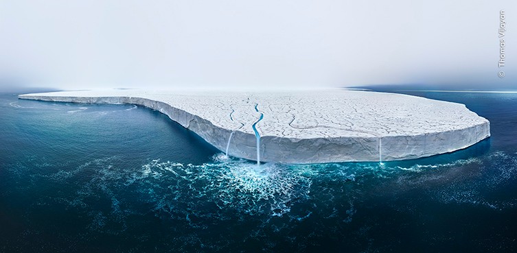 Μια ευρυγώνια φωτογραφία ενός τεράστιου στρώματος πάγου. Στην επιφάνεια του λευκού πάγου υπάρχουν αρκετά λαμπερά μπλε ποτάμια λιωμένου νερού που καταλήγουν στην άκρη του και βυθίζονται στο βαθύ μπλε νερό που περιβάλλει τον πάγο. Η αποτύπωση της επικής κλίμακας του παγετώνα Austfonna στη Νορβηγία ήταν μια πρόκληση για τον Thomas. Κατάφερε να δημιουργήσει αυτό το απίστευτο πανόραμα ράβοντας 26 καρέ που τραβήχτηκαν από ένα drone, παρουσιάζοντας το καλοκαιρινό λιώσιμο που ρίχνεται από την άκρη του παγετώνα Bråsvellbreen. Αυτός είναι ο τρίτος μεγαλύτερος παγετώνας στον κόσμο, αλλά όπως ανακάλυψε ο Thomas κατά την επίσκεψή του, το ετήσιο λιώσιμο του πάγου άρχισε πολύ νωρίτερα από το συνηθισμένο λόγω της εξελισσόμενης κλιματικής κρίσης.