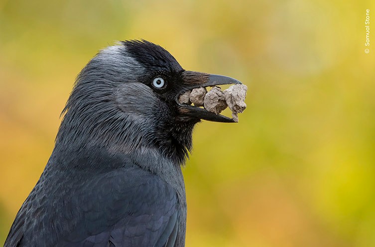 Μια φωτογραφία μίας καλιακούδας από το πλάι, η οποία κρατά τέσσερα κομμάτια πέτρας σε σειρά στο ράμφος της. Το φόντο είναι μια απαλή εστίαση από κίτρινα, πορτοκαλί και πράσινα χρώματα. Παρατηρώντας ένα ζευγάρι καλιακούδες να φτιάχνουν φωλιά σε μια τρύπα στον κορμό μιας ιτιάς στο Bushy Park του Λονδίνου, ο Samual άρχισε να παρακολουθεί τι έφερναν πίσω στη φωλιά. Στην αρχή, αυτές ήταν τούφες από τρίχες που έπαιρναν από τα ελάφια του πάρκου, αλλά ως εξαιρετικά προσαρμοστικά και έξυπνα πουλιά, οι καλιακούδες χρησιμοποιούν μια ευρεία γκάμα υλικών για την κατασκευή της φωλιάς. Ο Samual παρατήρησε ότι αυτό περιλάμβανε κάτι αρκετά ασυνήθιστο: σβώλους από χώμα και πέτρες, τις οποίες μετέφεραν στο ράμφος τους σε σειρά μεγέθους.