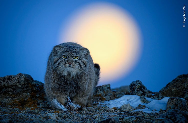 Μια φωτογραφία μιας γάτας του Παλλά που κοιτάζει κατευθείαν την κάμερα. Είναι λουσμένη σε ένα όμορφο βαθύ μπλε φως καθώς το κίτρινο φεγγάρι ανατέλλει πίσω της. Στα πόδια της διακρίνεται το φτερωτό σώμα ενός πουλιού. Ψηλά στο οροπέδιο της Μογγολίας, στο φως του φεγγαριού, μια γάτα του Παλλά μόλις είχε πιάσει τη λεία της. Ο Xingchao είχε εντοπίσει μια ομάδα από αυτές τις γάτες και άντεξε τις παγωμένες νυχτερινές συνθήκες για να βρίσκεται εκεί ακριβώς τη στιγμή που αυτή είχε πιάσει έναν άτυχο Μογγολικό κορυδαλλό λίγο πριν την αυγή.