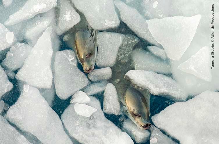 Μια φωτογραφία από ψηλά που δείχνει σπασμένα κομμάτια πάγου στο νερό. Ανάμεσα στα θραύσματα του πάγου, τα κεφάλια δύο φώκιων με κλειστά μάτια επιπλέουν στο νερό. Οι φώκιες Crabeater είναι τα πιο πολυάριθμα θαλάσσια θηλαστικά στον κόσμο, με περίπου επτά εκατομμύρια από αυτές να πιστεύεται ότι ζουν στα παγωμένα νερά που περιβάλλουν την Ανταρκτική. Σε μια εννιάμηνη αποστολή στην ήπειρο, η Tamara παρατήρησε εκατοντάδες από αυτές τις φώκιες να ακολουθούν το πλοίο και τελικά να αποκοιμιούνται ανάμεσα στους πάγους, επιτρέποντάς της να τραβήξει αυτήν την εξαιρετική φωτογραφία.
