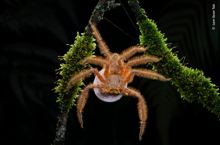 Μια φωτογραφία μιας σκούρας πορτοκαλί αράχνης, με τα πόδια της τεντωμένα ανάμεσα σε δύο κλαδιά καλυμμένα με βρύα. Η φωτογραφία είναι φωτισμένη από πίσω, δείχνοντας τα εξαιρετικά χνουδωτά πόδια της αράχνης και τον λευκό σάκο αυγών που κουβαλάει κάτω από το σώμα της με όμορφη λεπτομέρεια. Ονομάστηκε ως φόρος τιμής στον Ziggy Stardust και τους Spiders from Mars, το alter ego του David Bowie και της μπάντας του στη δεκαετία του ’70, η αράχνη David Bowie βρίσκεται στα τροπικά δάση της Μαλαισίας. Εντοπίζοντας αυτό το άτομο να φρουρεί έναν λευκό δίσκο αυγών, ο Lam κατάφερε να τραβήξει αυτήν την όμορφη φωτογραφία της αράχνης καθώς κρατιόταν σε ένα κλαδί στην άκρη ενός ποταμού.