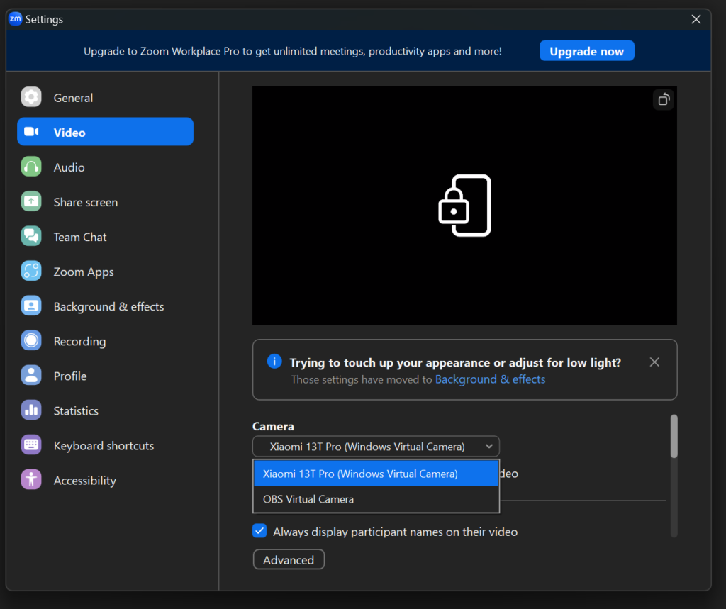 Μόλις ολοκληρωθεί η σύνδεση, μπορείτε να χρησιμοποιήσετε την κάμερα του κινητού ως webcam σε οποιαδήποτε εφαρμογή που υποστηρίζει κάμερα, όπως το Zoom ή το Microsoft Teams. Η εφαρμογή Windows Camera μπορεί επίσης να χρησιμοποιηθεί για δοκιμές.