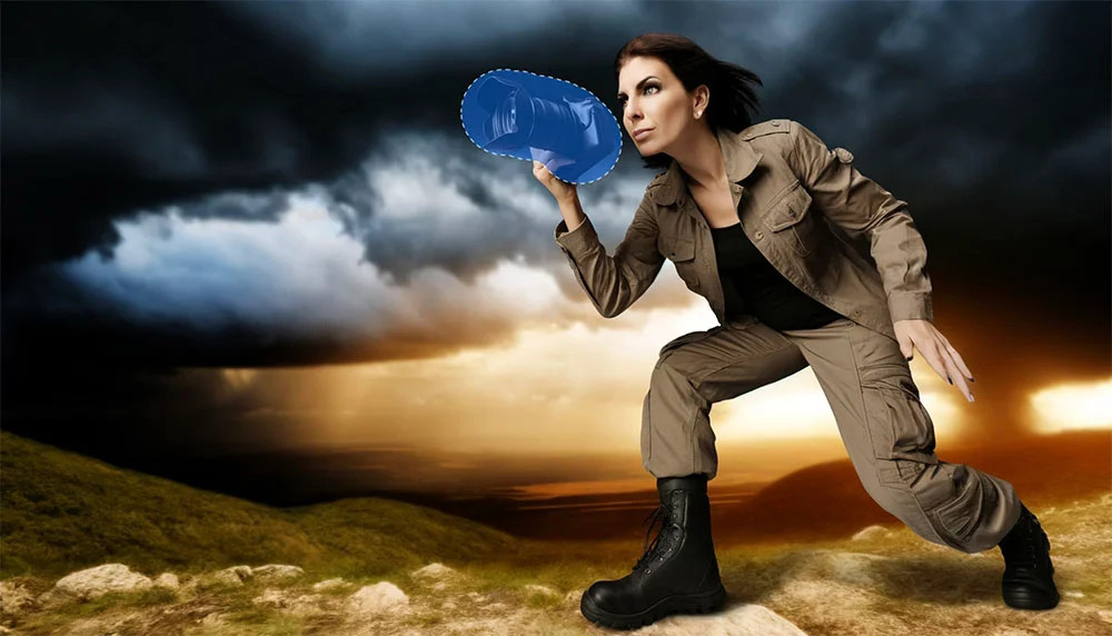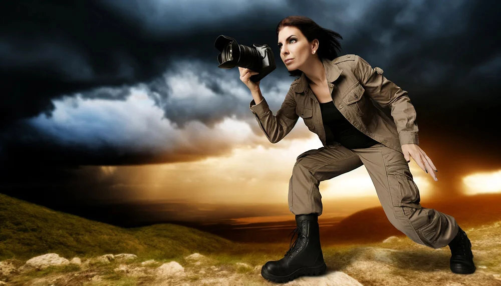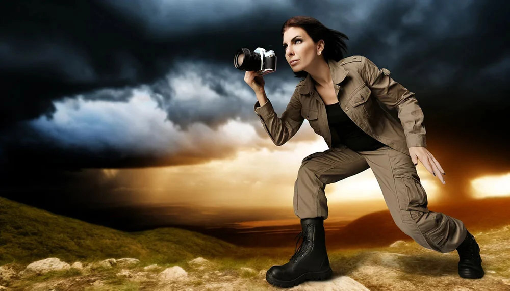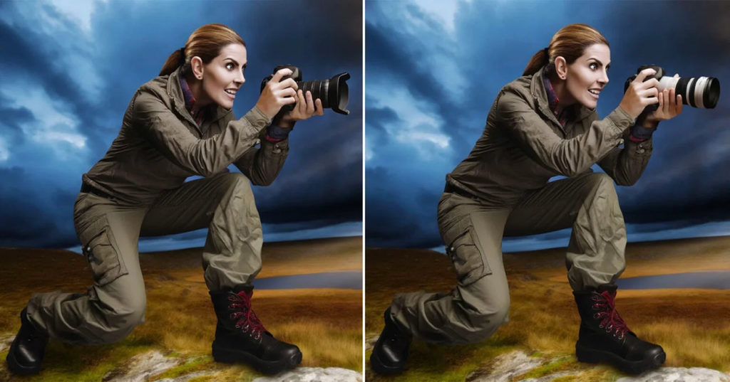 Δείτε ένα ακόμη παράδειγμα όπου αρχικά χρησιμοποιήθηκε η ίδια εντολή κειμένου για δημιουργία εικόνας “A fearless female photographer operating in the field, widescreen aspect ratio”. Στη συνέχεια επισημάνθηκε με το select tool η κάμερα που κρατάει η γυναίκα στη φωτογραφία και δόθηκε η εντολή “Replace lens with a 400mm telephoto lens”: